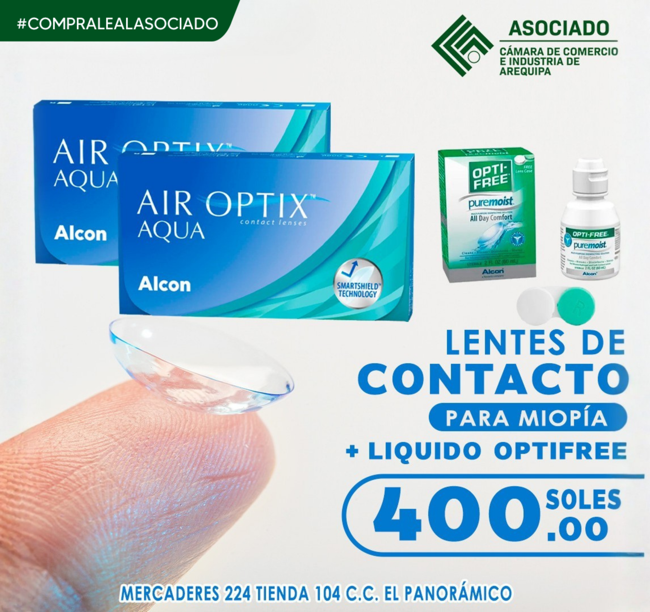 No dejes pasar esta increíble oferta: ¡LENTES DE CONTACTO PARA MIOPÍA!, ¡Ideales por si practicas algún deporte o tienes que hacer alguna actividad y tus lentes te molestan! Precio de locura: ¡A solo S/400.00 llévate dos cajas de AIR Optix Hydraglyde su liquido desinfectante de 60ml y su estuche de regalo! Cada cajita contiene 6 unidades de lente de contacto que dura 1 mes aproximadamente ¡No esperes más! Aprovecha la oferta y asegúrate de aprovechar esta gran promoción.